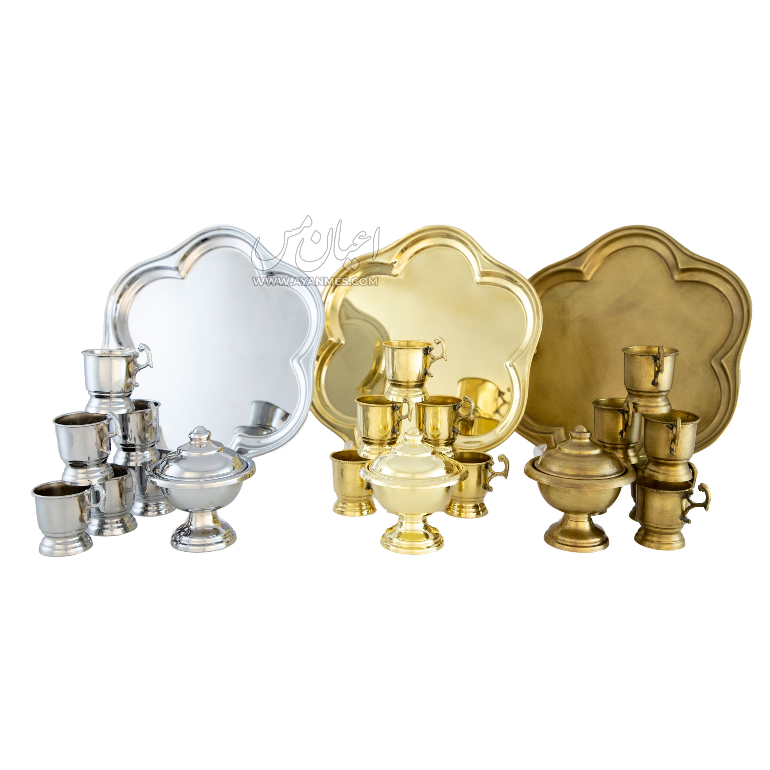 یک سینی برنجی با حاشیهی طرح گلبرگ جز سوم این ست چایخوری اعلا را تشکیل میدهد. هر سه رنگ این سینی در عین سادگی زیبایی چشم نوازی دارد که میتواند علاوهبر کاربرد معمول آن بهعنوان سینی، بصورت دکوری نیز مورد استفاده قرار گیرد.